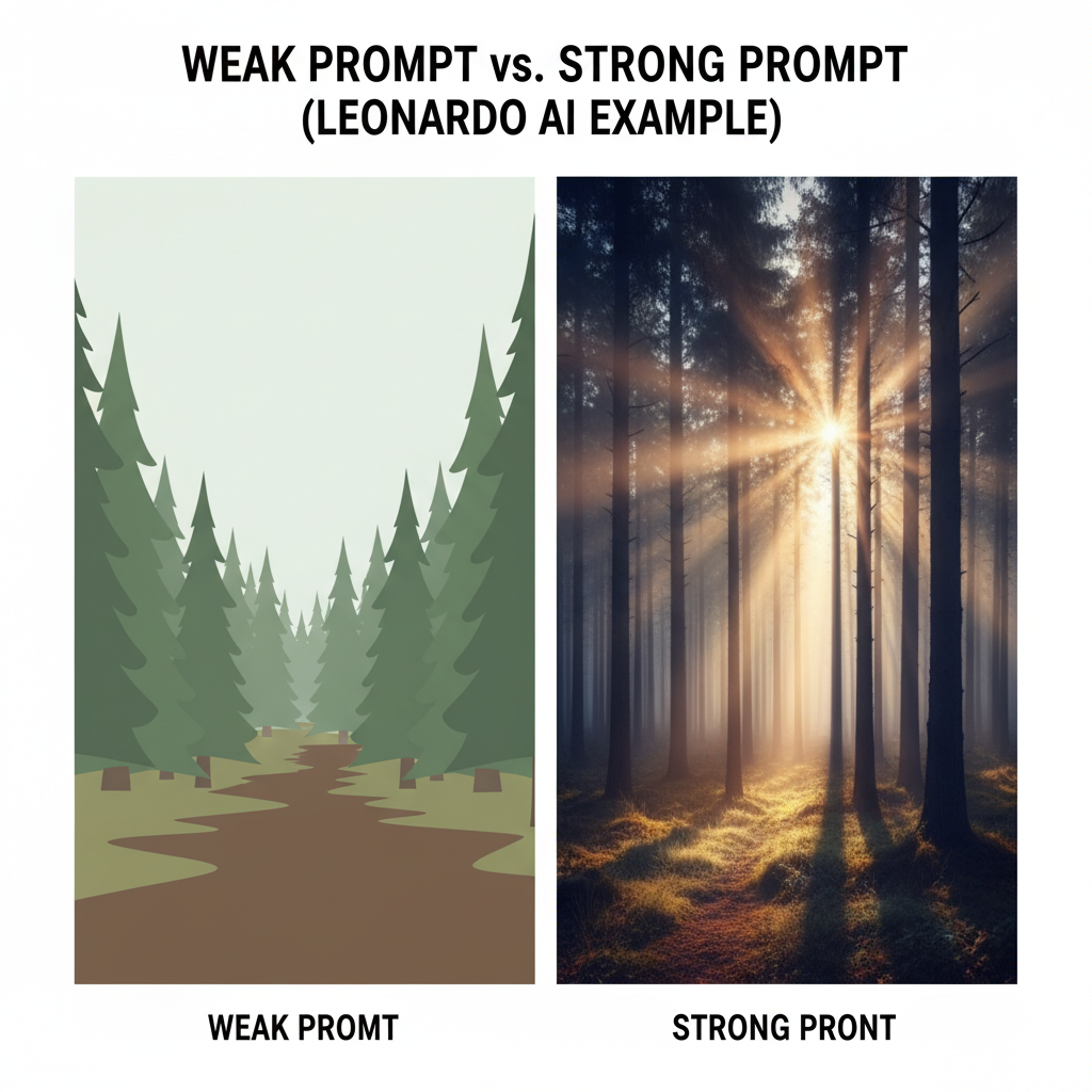 - Strong Leonardo prompt: “A cinematic forest at dawn, golden rays filtering through tall pine trees, soft mist rising, hyper-realistic 8K details.”